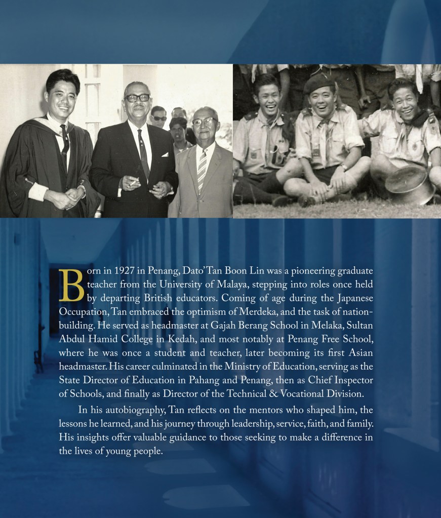 Born in 1927 in Penang, Dato’ Tan Boon Lin was a pioneering graduate teacher from the University of Malaya, stepping into roles once held by departing British educators. Coming of age during the Japanese Occupation, Tan embraced the optimism of Merdeka and the task of nation-building. He served as headmaster at Gajah Berang School in Melaka, Sultan Abdul Hamid College in Kedah, and most notably at Penang Free School, where he was once a student and teacher, later becoming its first Asian headmaster. His career culminated in the Ministry of Education, as the State Director of Education in Pahang and Penang, followed by his role as Chief Inspector of Schools and finally as Director of the Technical & Vocational Division.